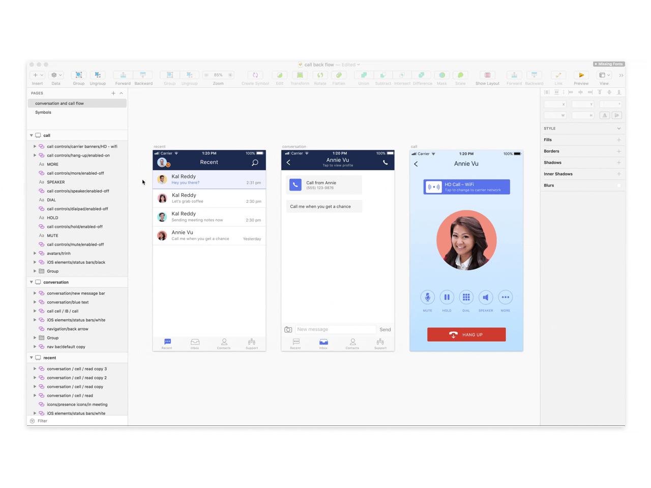 Dialpad didn’t have a design system or shared library. Most new design projects were built by digging for older files and copying elements into a new project file – a tedious and error-ridden process. Design files never resembled shipped projects because designers and engineers had different names for patterns and components.